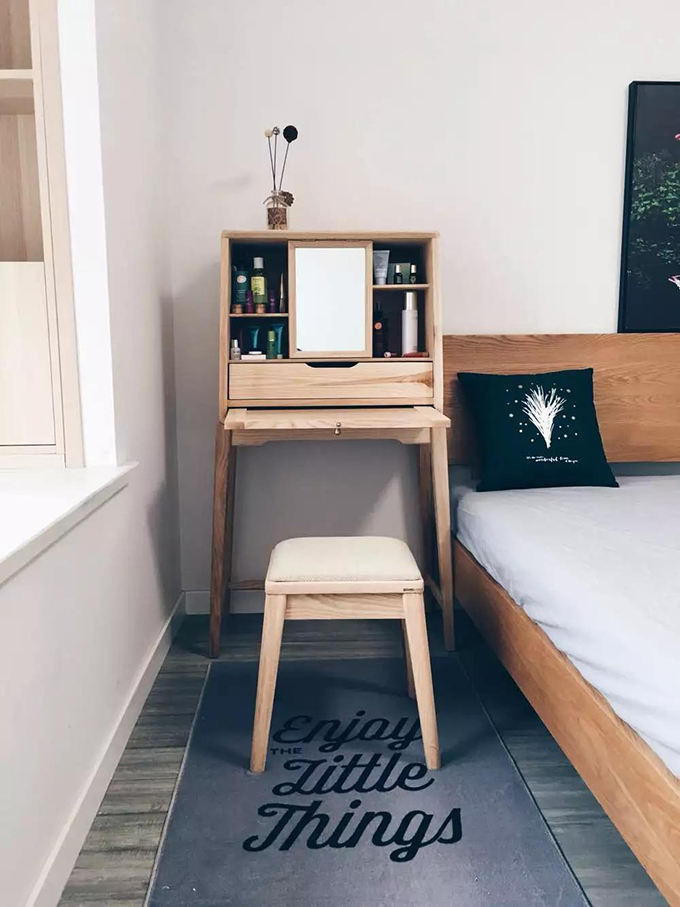 4其他個(gè)性設(shè)計(jì) 小茶幾、凳子、化妝臺(tái)也同樣適用于床頭。相對(duì)傳統(tǒng)的笨重床頭柜,這樣小巧輕盈的設(shè)計(jì),不占太多的空間,基本的收納完全沒問題。最重要的是,相比普通的床頭柜,這些小臥室小家具變成了裝飾品的一種,簡直太完美了。