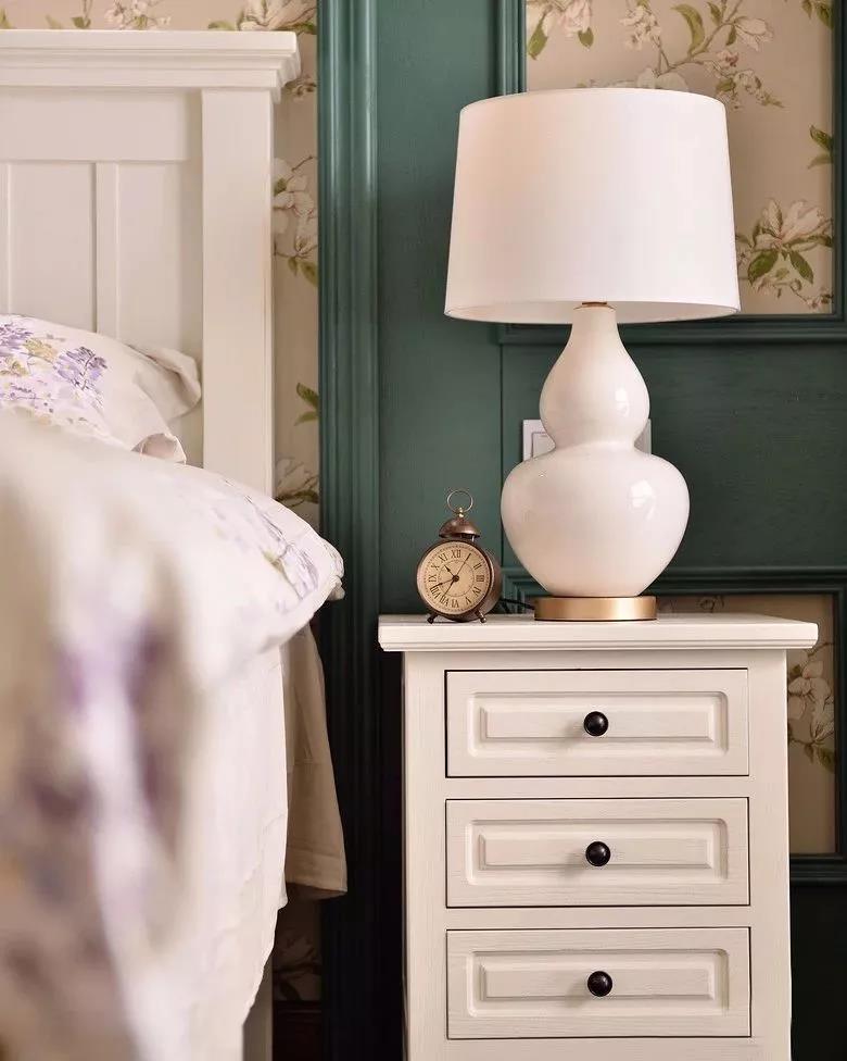 床頭旁邊的抽屜床頭柜,還有一只葫蘆造型的臺(tái)燈,一只復(fù)古鬧鐘,精致的細(xì)節(jié)讓房子充滿了優(yōu)雅的氣息。