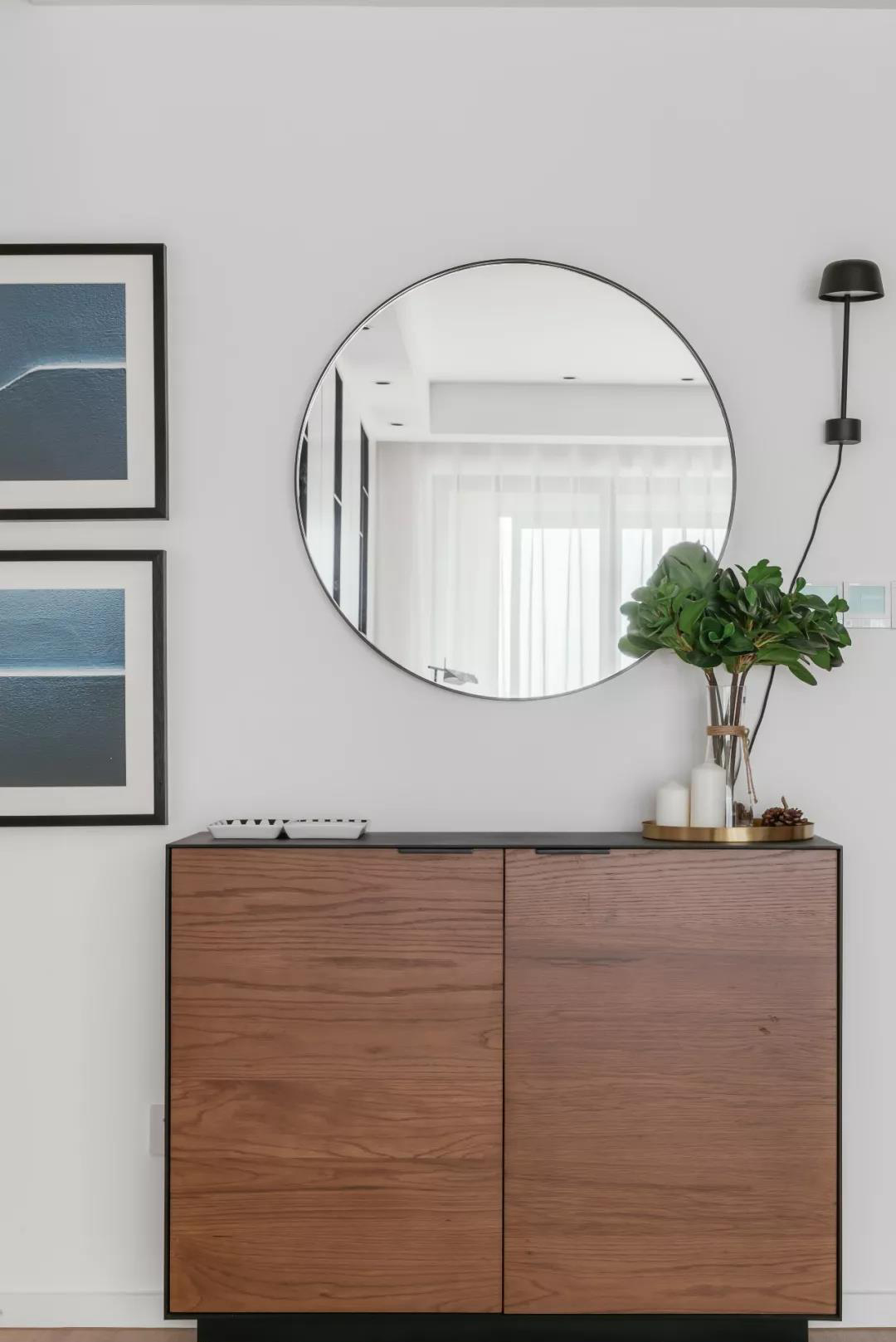 過道相對開闊,在臨近客廳處放置邊柜,上方懸掛鏡子以及裝飾畫組合可以增加生活氣息,同時鏡子不同角度反射出客廳的面貌也讓生活增加了一絲樂趣。