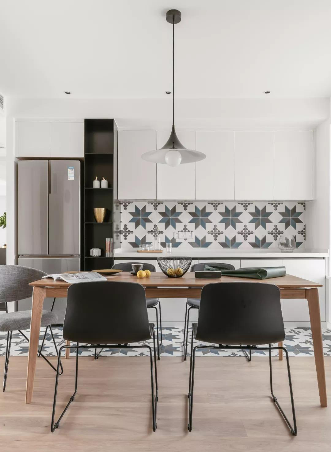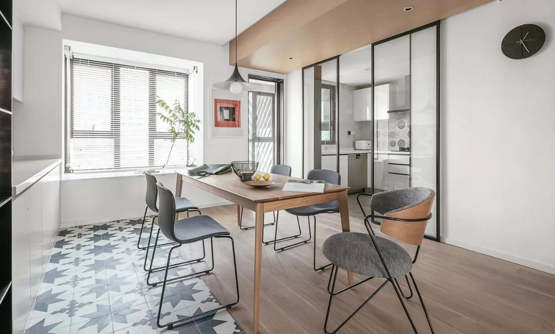 餐廳最初看上了見南花的花磚,于是由餐廳墻面延伸至地面,地面再結(jié)合地板,形成比較好的裝飾面,地板和地磚結(jié)合的地方不宜使用大壓條,可以設置實心不銹鋼條在地板和地磚之間收口。
