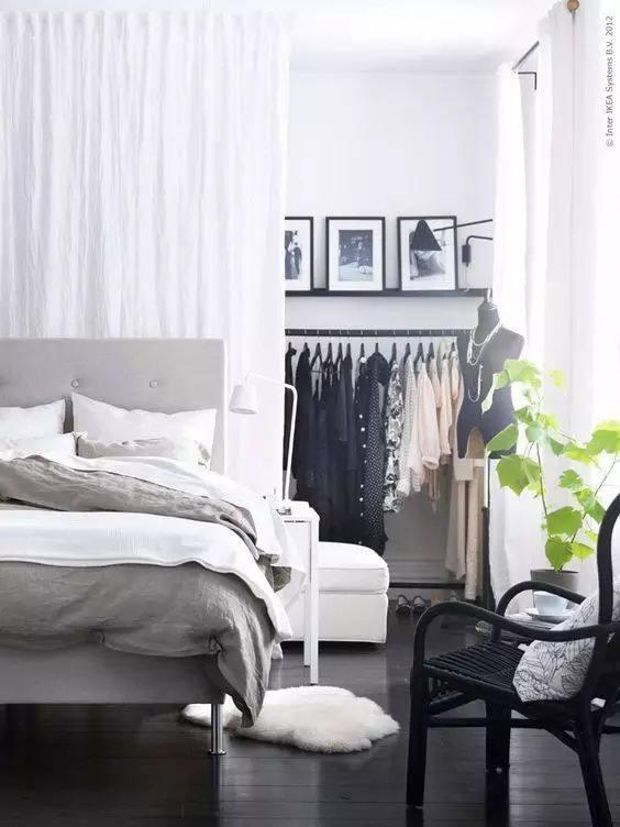 利用滑動式窗簾,在臥室床的后面分割出一個衣帽間,即使是小戶型,也可以擁有步入式衣柜。