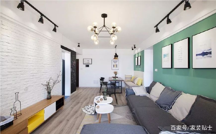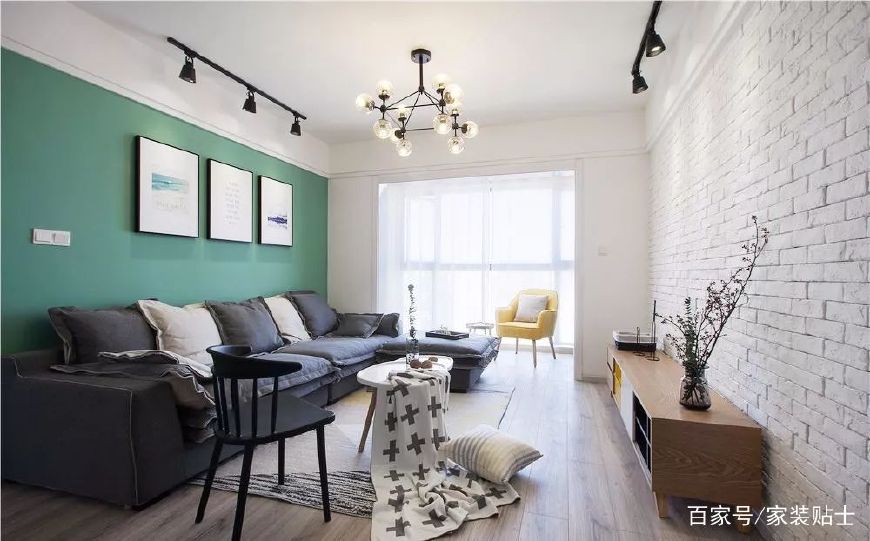 ▲ 客廳以墨綠色、白色和原木色為主色調,再由灰色和鵝黃色來點綴局部,地板和沙發(fā)的灰色是空間中顏色的過渡與調和,更加貼近自然且不失簡潔。