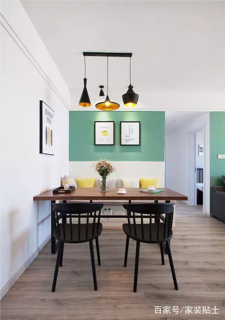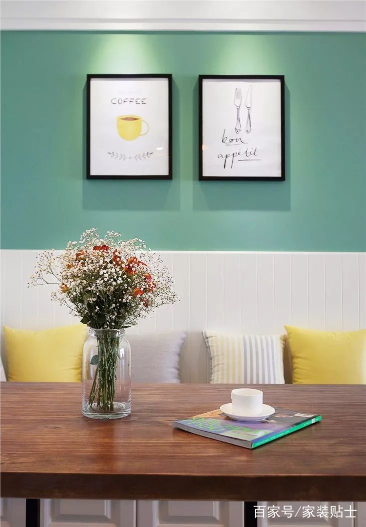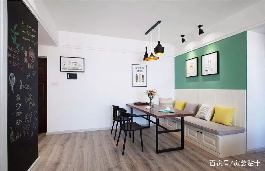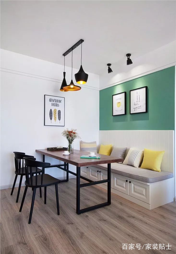 ▲ 餐廳利用卡座的形式,增加了儲物的功能。墻面顏色選擇和沙發(fā)背景墻顏色一樣,增加空間的連貫性。
