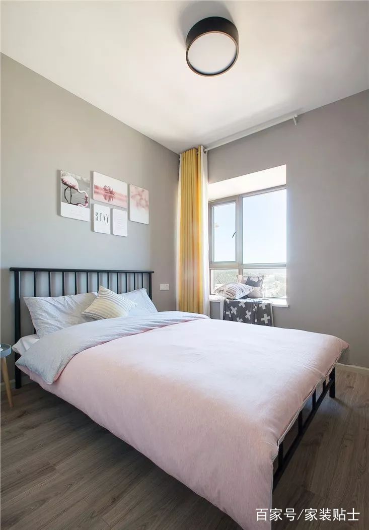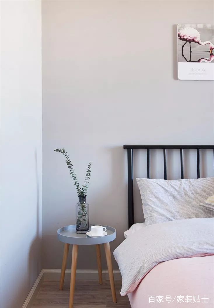 ▲ 次臥與主臥的風格相得益彰,灰色的墻面加黑色的鐵藝床,粉色的裝飾畫與床品,恬靜溫馨。