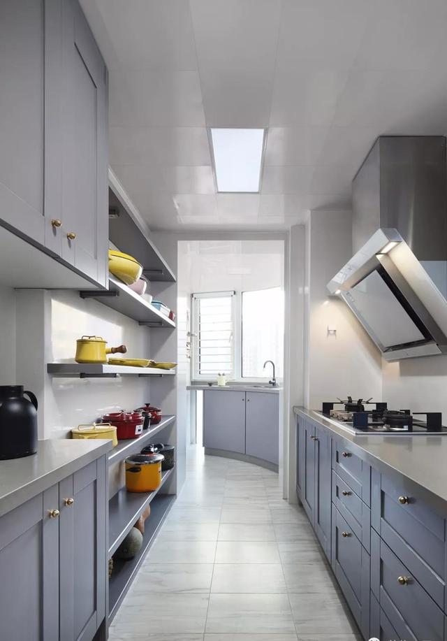 ▲ 利用房型結(jié)構(gòu),打造弧度廚房,藍(lán)灰色櫥柜搭配隔架置物,收納柴米油鹽的瑣碎