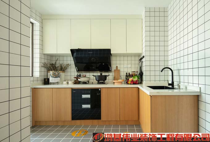 廚房以暖系白色為主色,搭配了原木色的櫥柜設計,吊柜+地柜組合,收納性擴大不止一倍。白色的墻磚,顯得廚房干凈簡潔,加上窗戶采光性好,讓整個廚房光線明亮,營造一個舒適時尚的烹飪空間。