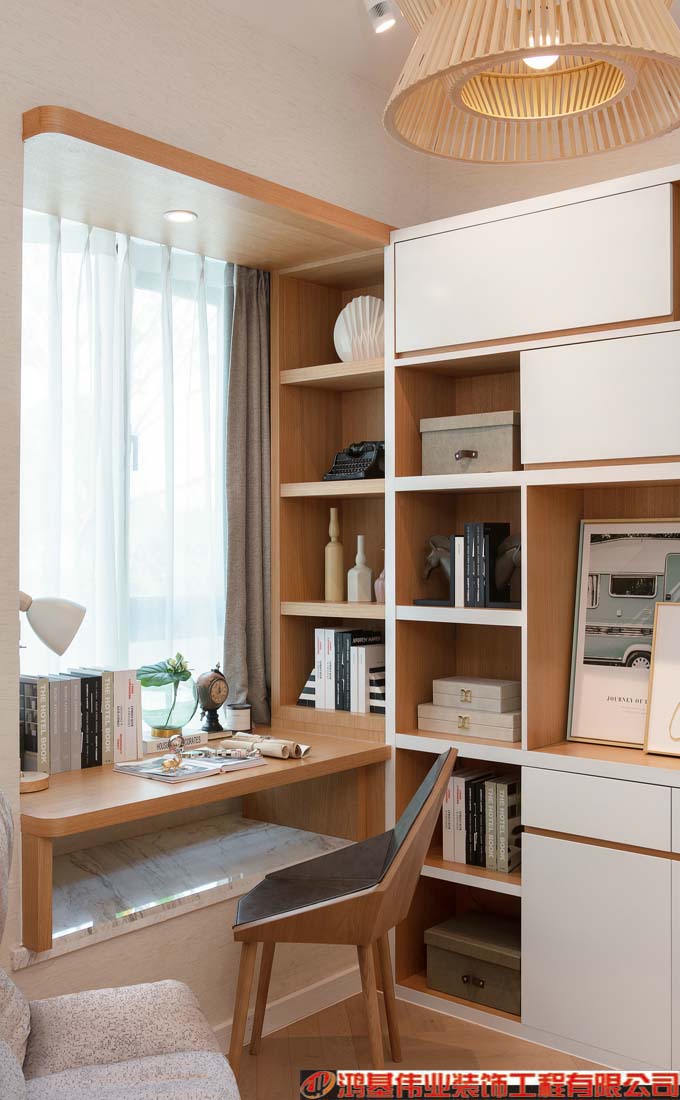 書房視野開闊,白色墻面柜體搭配原木家具、地板,顯得格外的自然協調,書桌與書柜一體化,擴大了收藏空間。清新自然的北歐風,總能帶給人們以舒適嫻靜,我們希望給人帶來如沐春風般的感覺。