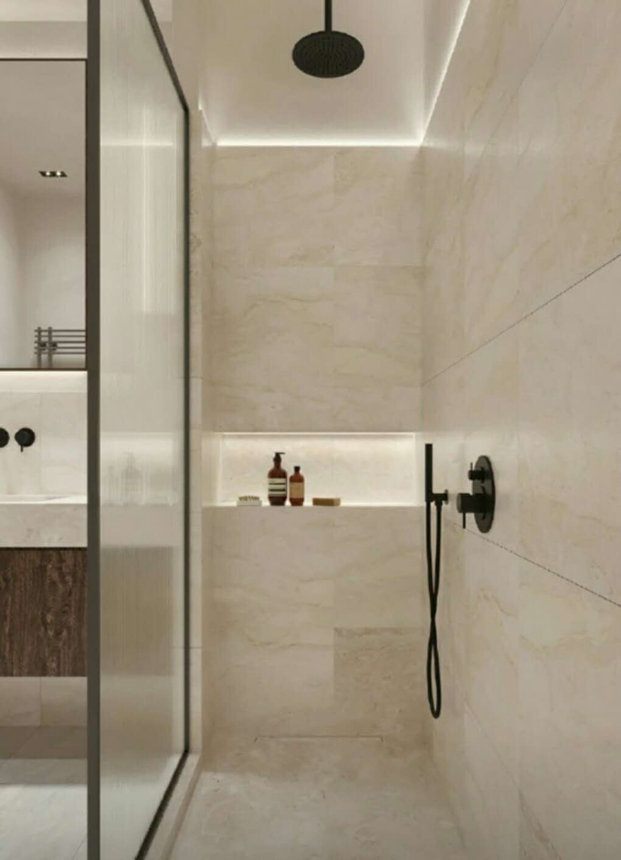 防滑磚是首選,增加防滑效果,可以選擇在淋浴區(qū)的地磚上拉槽,來增加摩擦力。