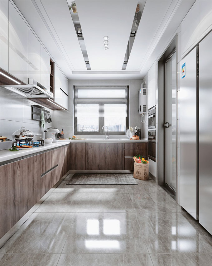 所以一字型廚房的設(shè)計有點在于不占地,滿足基本使用,但是也不方便人員走動,儲物空間少。